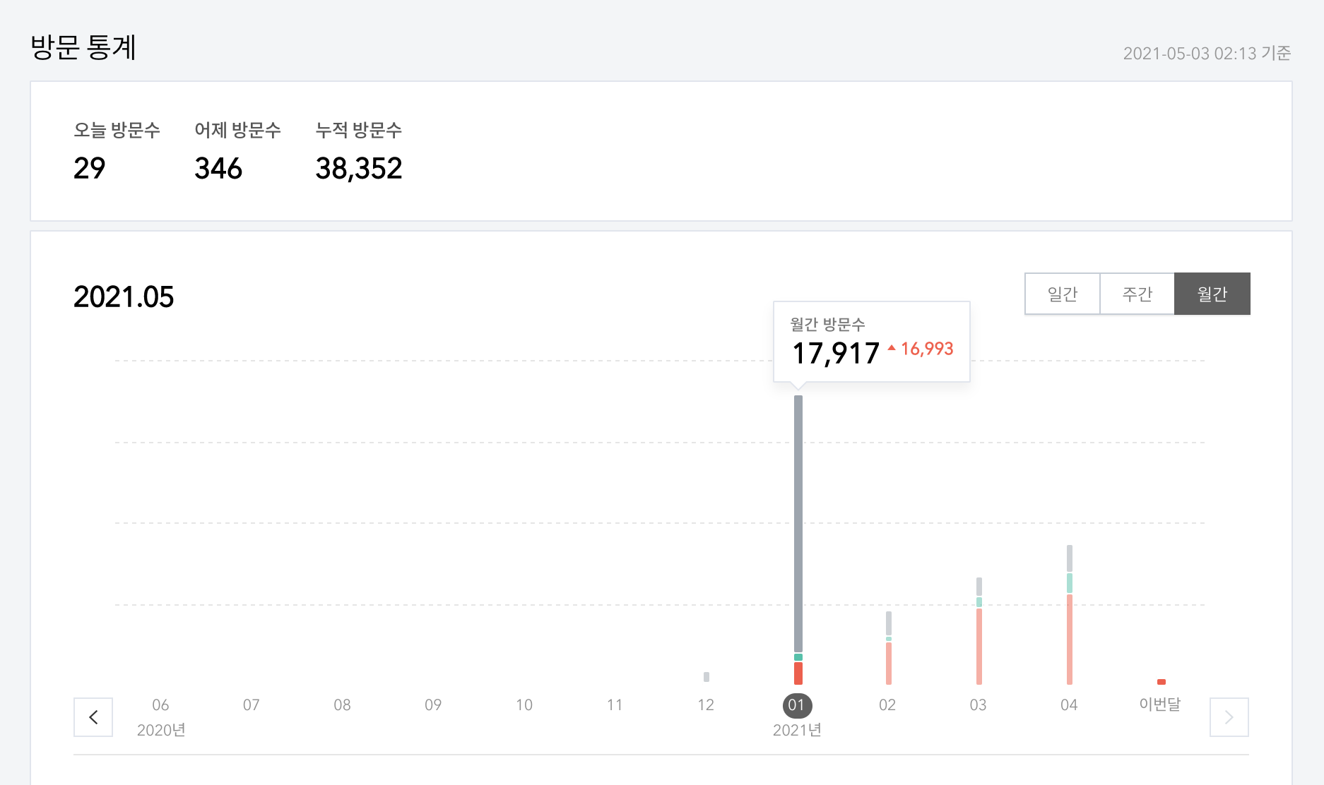 그 1월달에는 방문자수는 참고로, 1월의 하루 방문자수는 17,917명! 2월은 4,647명 / 3월은 6,637명 / 4월은 8,643명 이다. 이번달(5월)은 아직 3일 새벽 2시를 지나고 있는 현재까지는 652명이다.