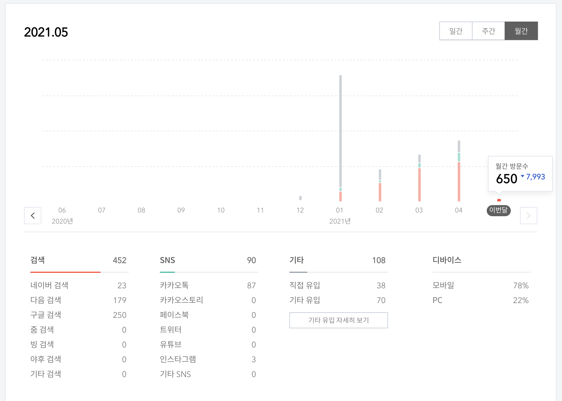 확실히 차근 차근 늘고 있는 방문자수 ! 1월달은 참고로 다음 메인에 걸렸던 적이 있어서 저렇게 말도 안되는 막대기가 ㅋㅋㅋ