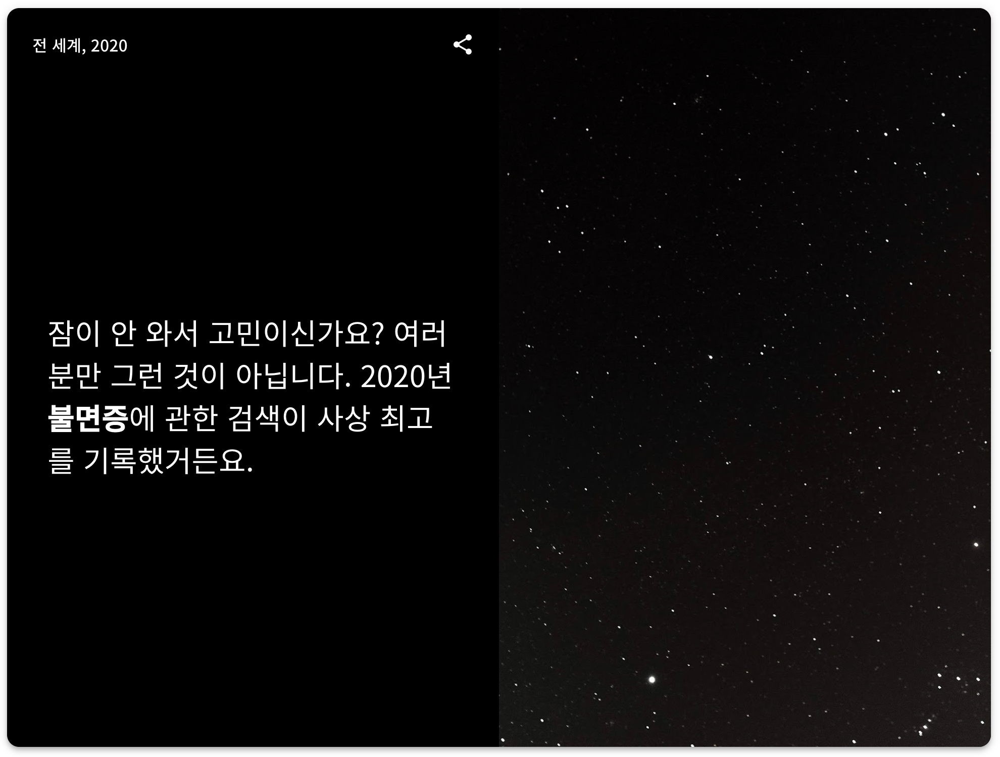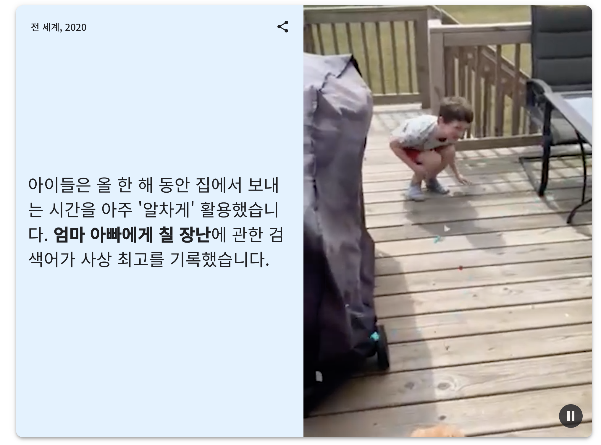 이것과는 다르게 작년의 트렌드를 소개해주는 구글에서 발표한 재밌는 링크가 있어서 소개해드리려고 합니다. 작년에 만들어진 것 같은데, 이제야 알아서 직접 해봤습니다.
