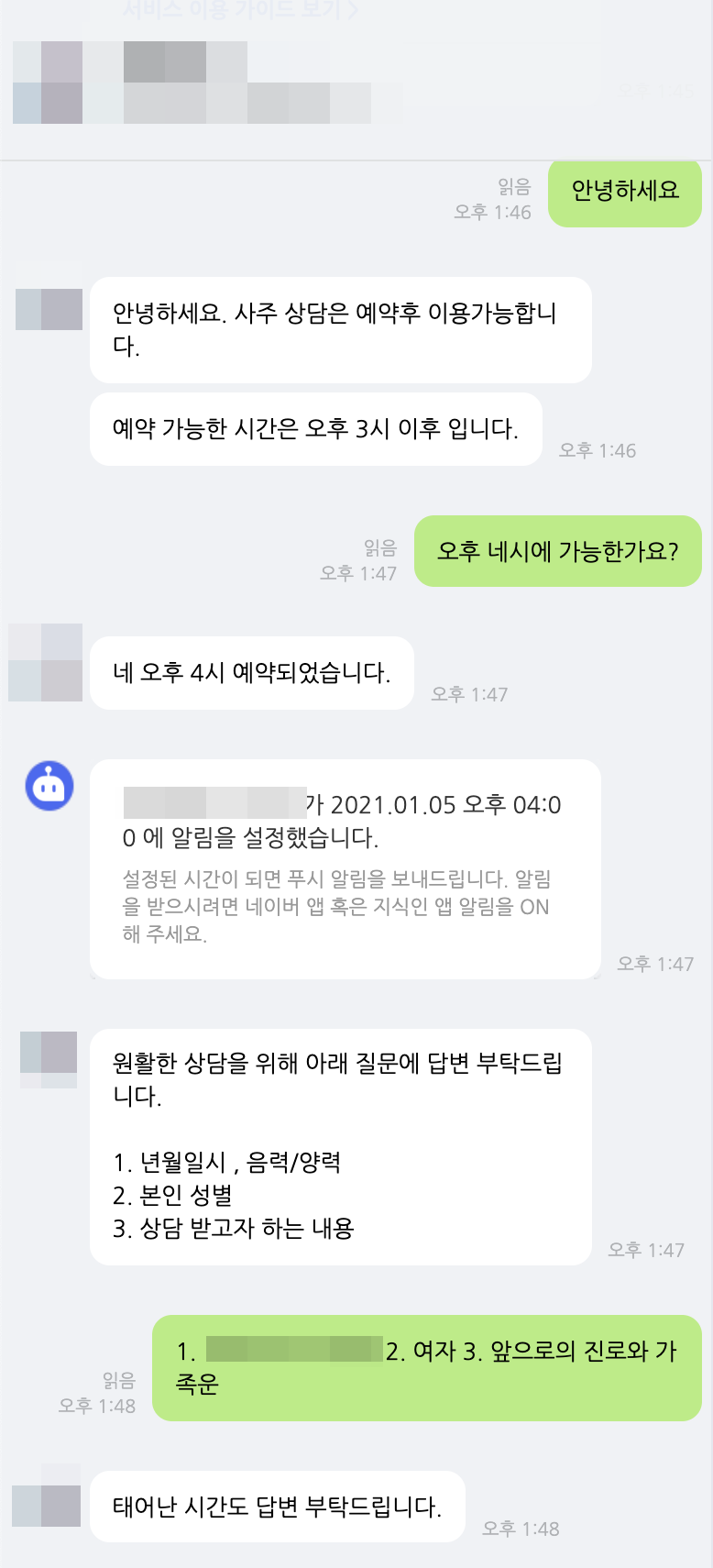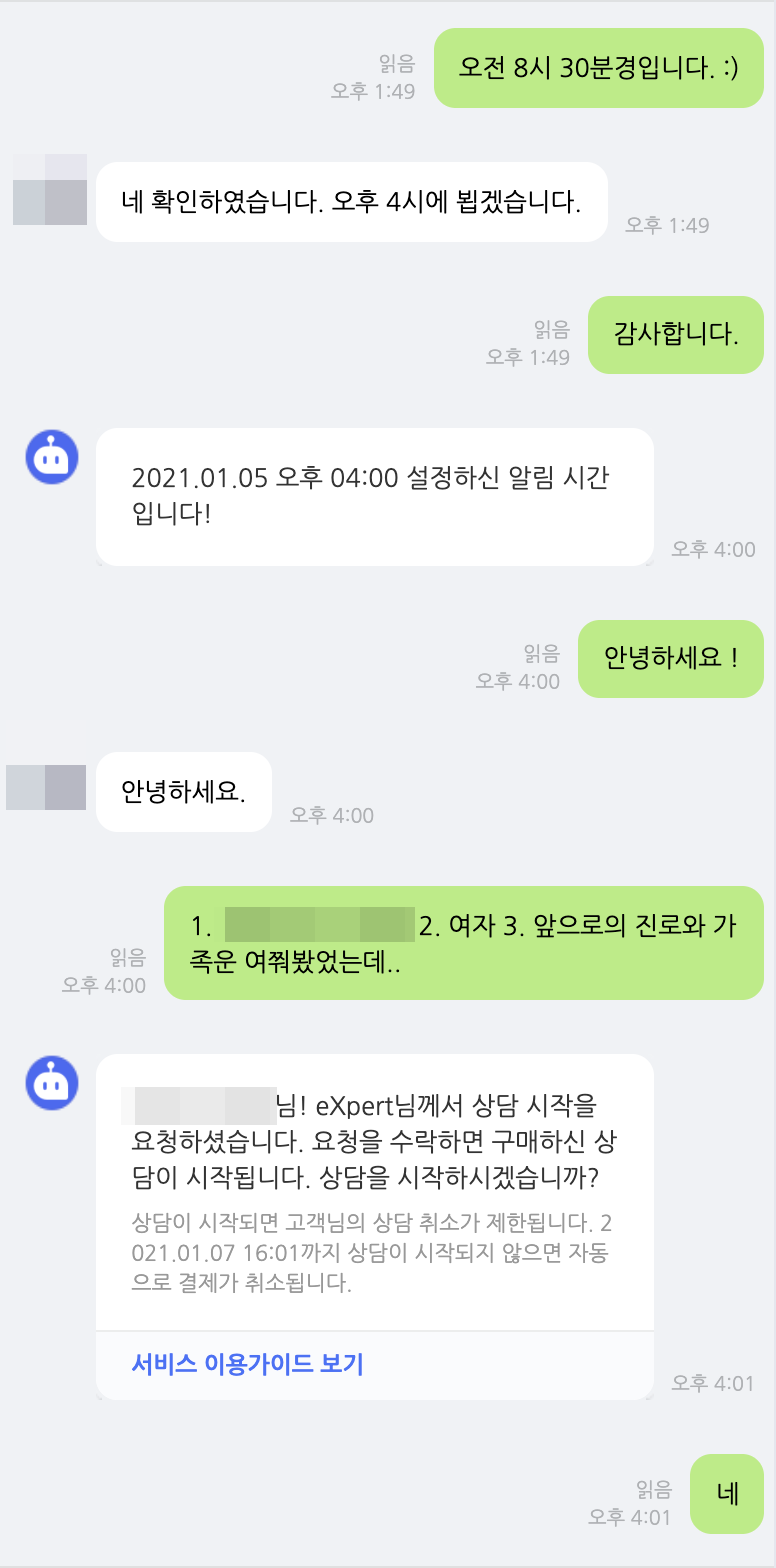 음성상담도 가능한 분들이 있고, 카톡처럼 텍스트로 할 수 있는 분들이 있고 둘 다 가능한 분들이 있습니다. 알아서 잘 선택해보시길 바랍니다. 알맞은 시간을 예약합니다. 그러면 신기한 게 설정한 시간으로 알림이 뜹니다.