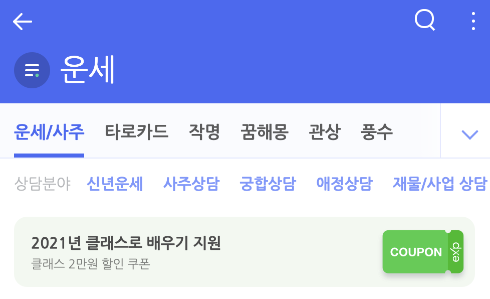 신년 운세 할인쿠폰 오천원을 받았으니, 궁금한 엑스퍼트/전문가를 찾아봅니다. 신년운세 사주상담 궁합 상담 애정 상담 재물/사업 상담 작명 상담 기타 운세 타로카드 손금 등 다양한 분야의 운세 전문가분들이 이미 계셨고, 저는 간단하고 저렴하게 받고 싶어서, 리뷰를 읽고 제가 보고 싶었던 분에게 찾아서 예약을 하려고 했습니다.