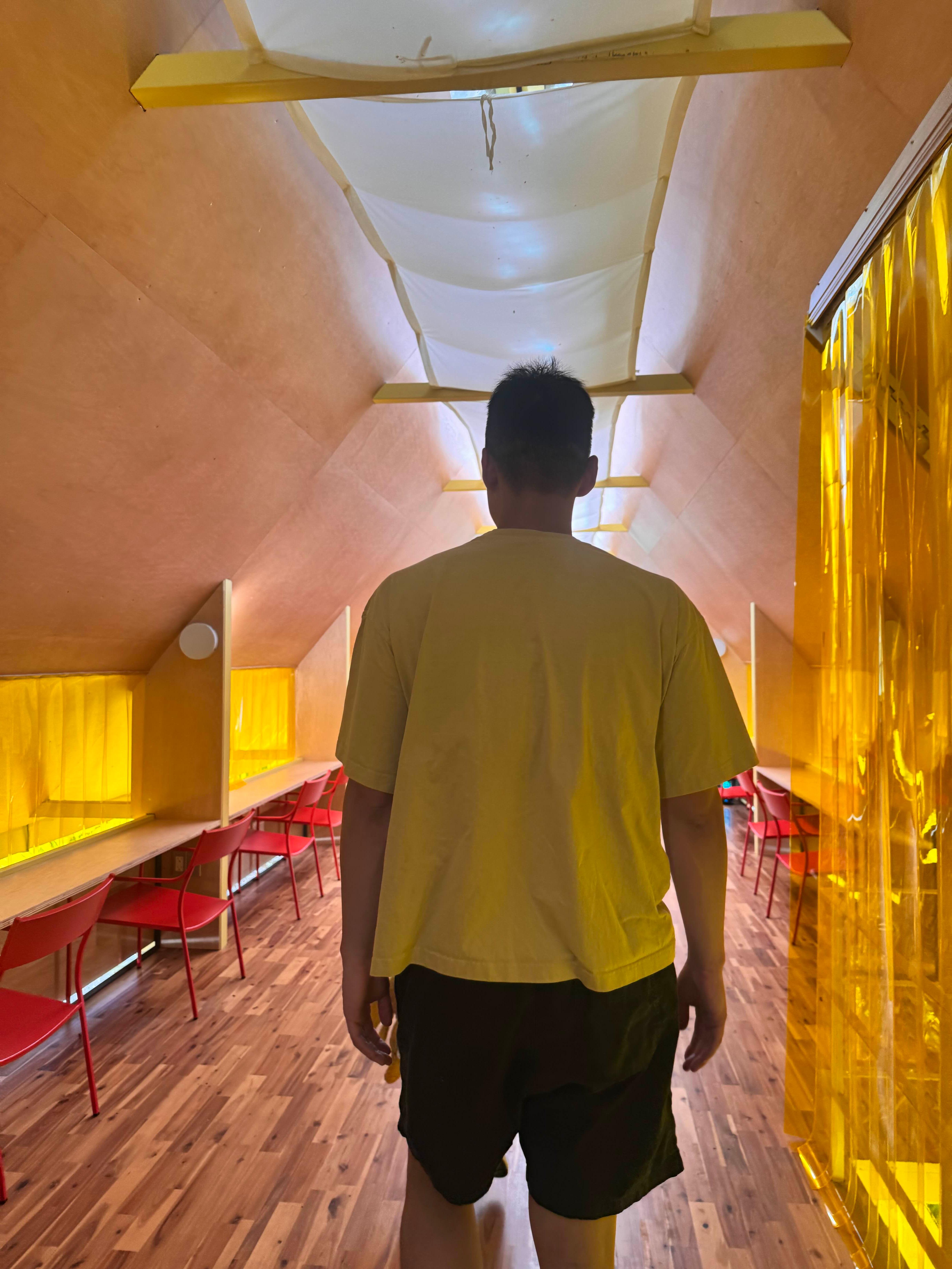 2층은 길게 있는데 에어컨 있는 쪽만 ㅋㅋㅋ 사람들이 있어요. 선풍기도 따로 틀어주는데 너무 더워요...ㅠㅠ ㅋㅋ 전체적으로 노란색이 컨셉인 것 같은데 우연히도 우리 가족들도 다 노랑으로 입고 온 날이었어요.